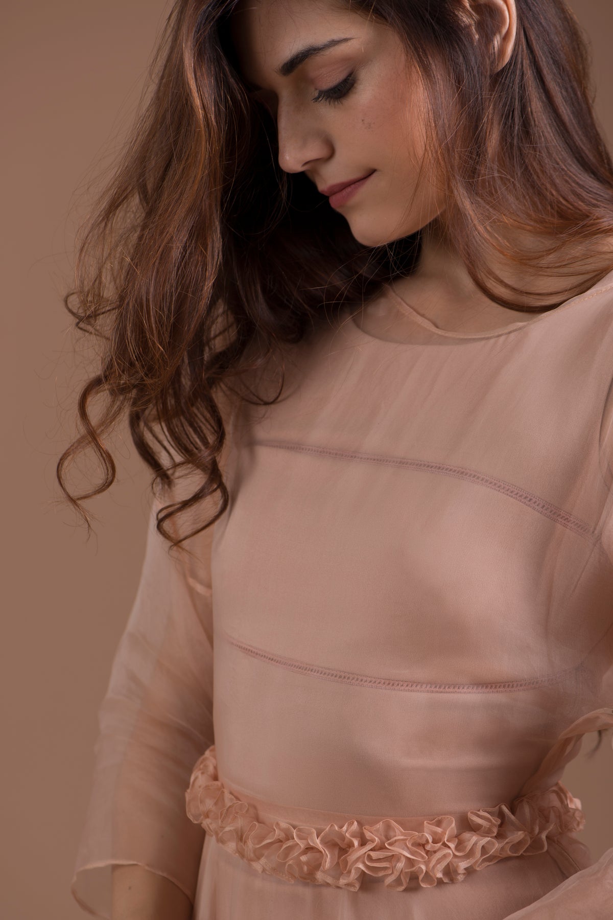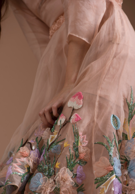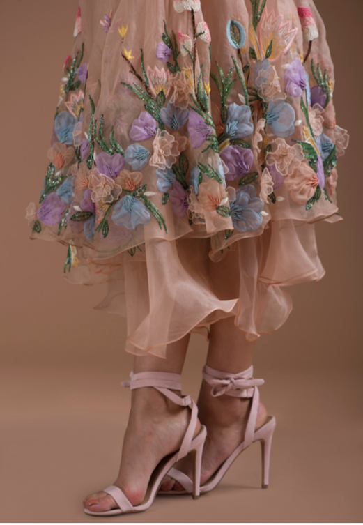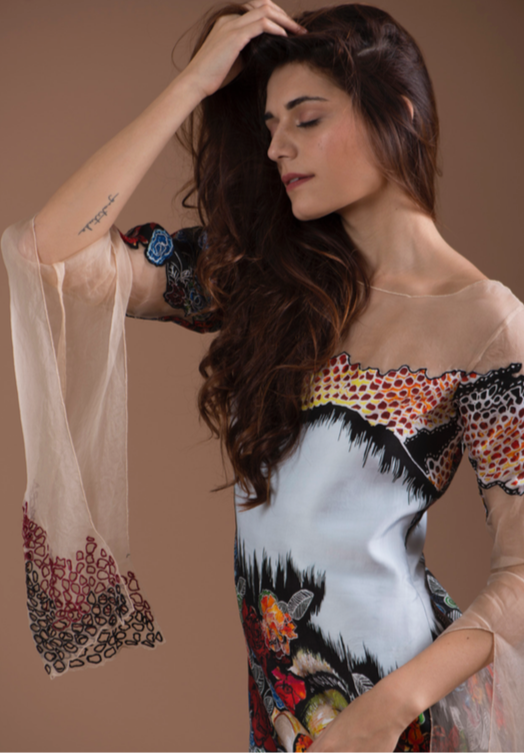 Regular price ₹ 9,500.00 Save ₹ -9,500.00Digitally printed triangle drape print shirt dress with hand embroidered fruit patchwork with 3D fabric detailing on the organza patch sleeeves.