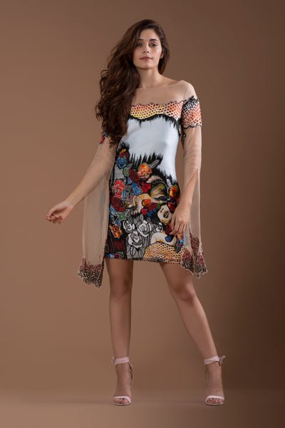 Geometric fruit print and 3D Printed fabric embellished patch dress