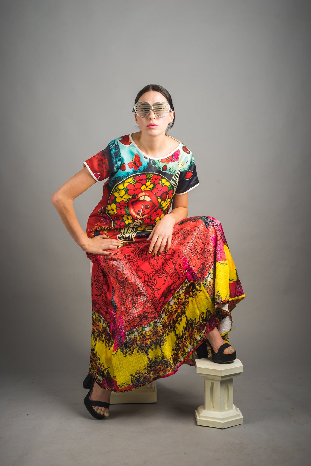 Regular price ₹ 12,000.00 Save ₹ -12,000.00Flared skirt consisting of 6 meters of fabric hand illustrated and printed with our pomogrante print.