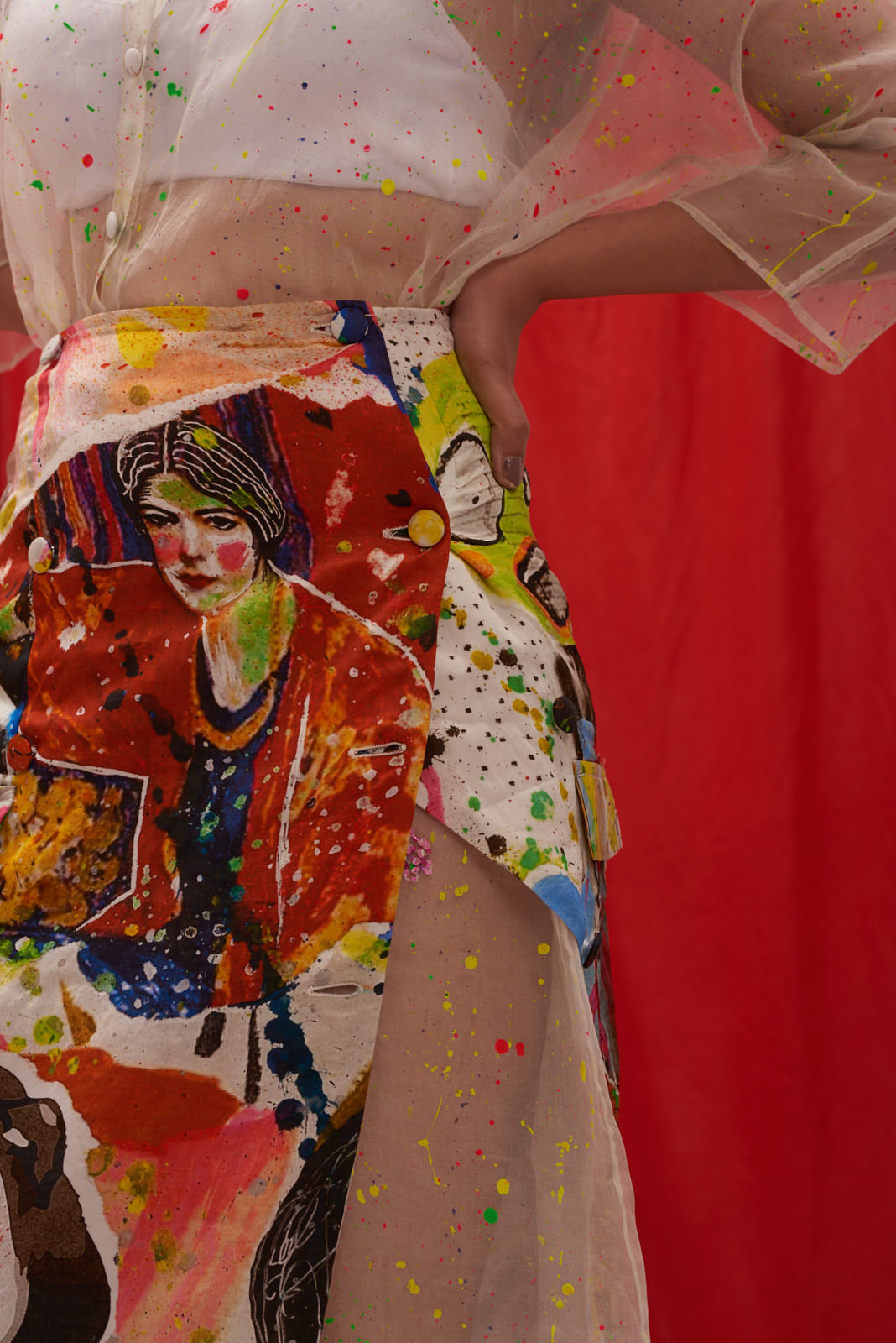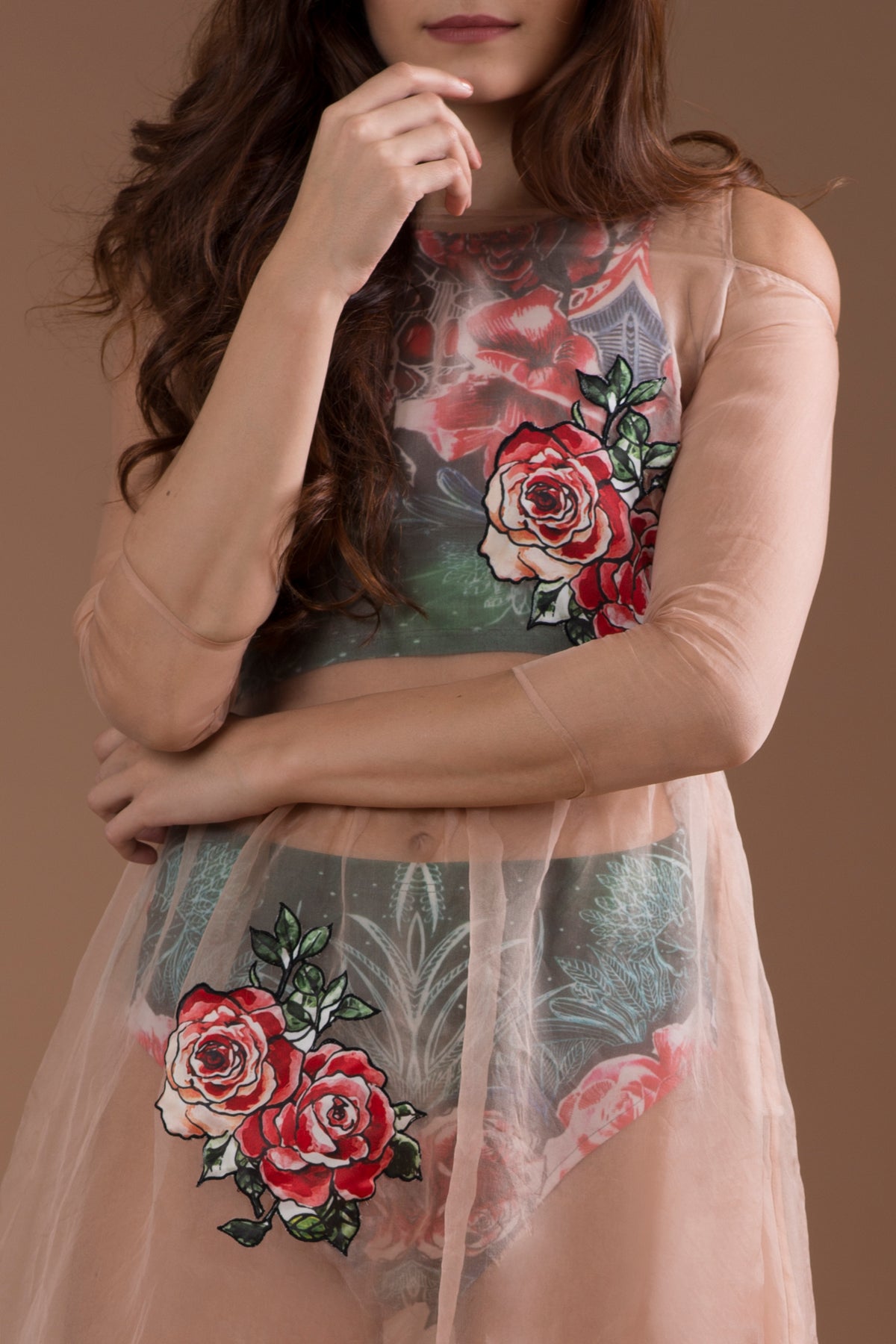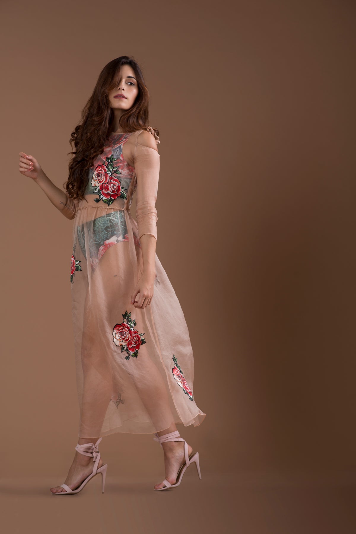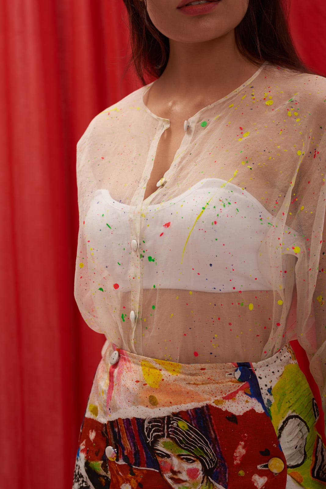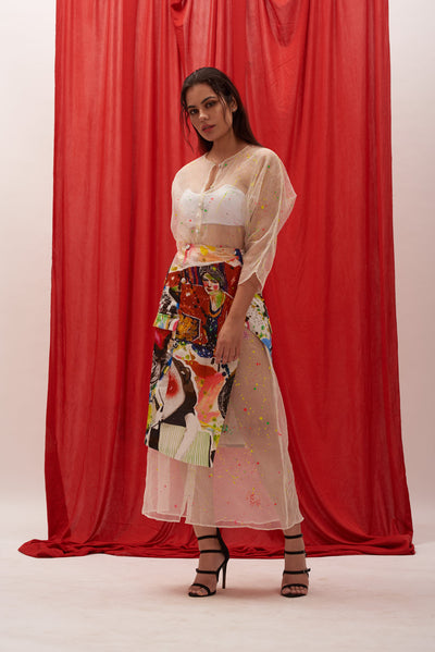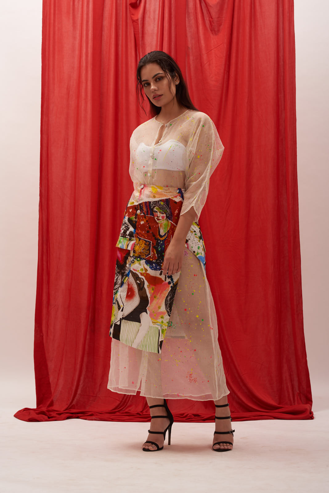 Regular price ₹ 11,000.00 Save ₹ -11,000.00Blush peach hand splashed organza tunic made in silk organza has been hand painted.