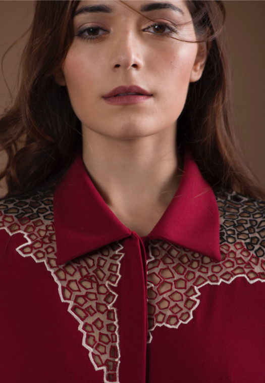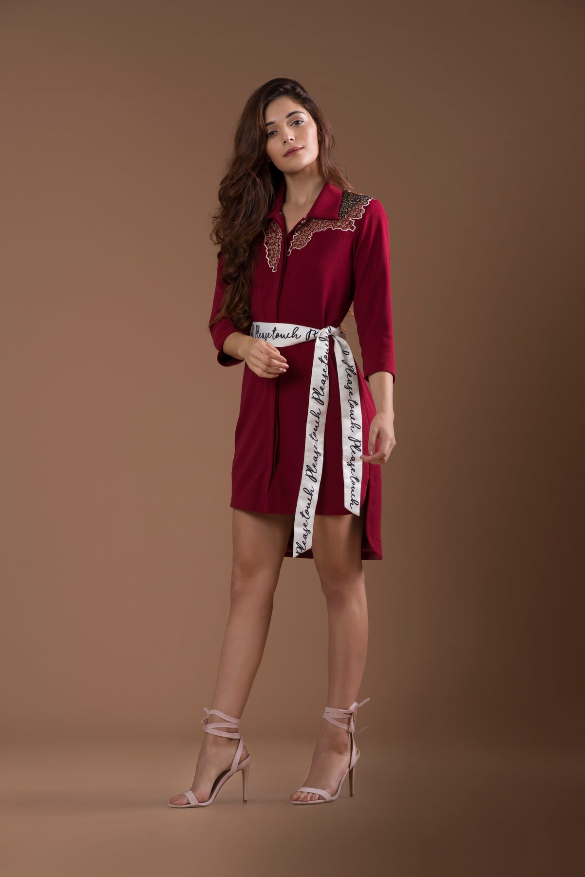Regular price ₹ 14,500.00 Save ₹ -14,500.00Cutwork hand embroidered, asymmetric heavy stretch georgette shirt dress. Front open, with 'Please Touch' matte satin Obi belt.