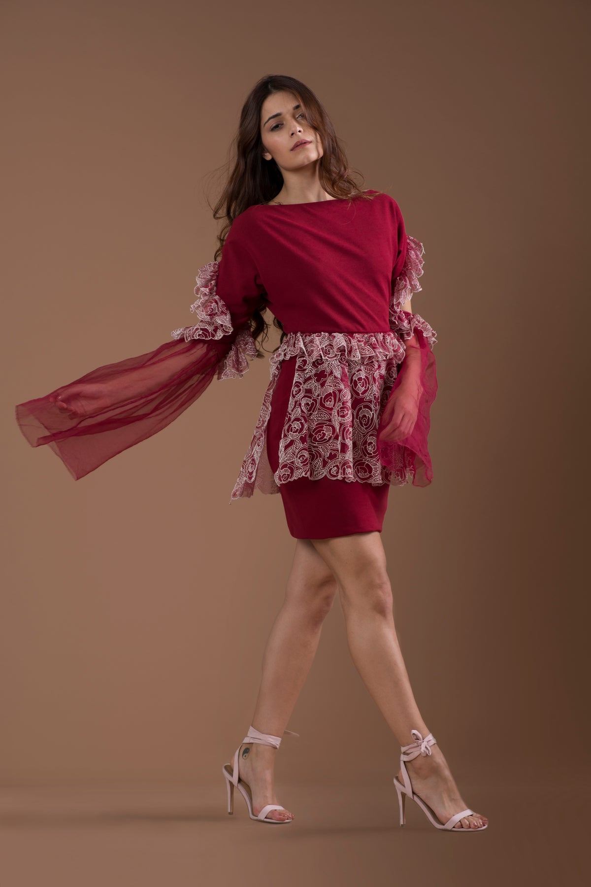 Regular price ₹ 13,500.00 Save ₹ -13,500.00Marsala short dress with full sleeves organza ruffle detailed exaggerated sleeves. Embellished with all over rose artwork in 3D rogan technique.
