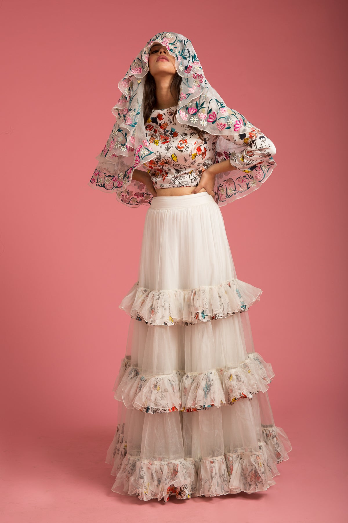 Regular price ₹ 18,500.00 Save ₹ -18,500.00Floral embroidery hand embroidered on organza double layer veil.