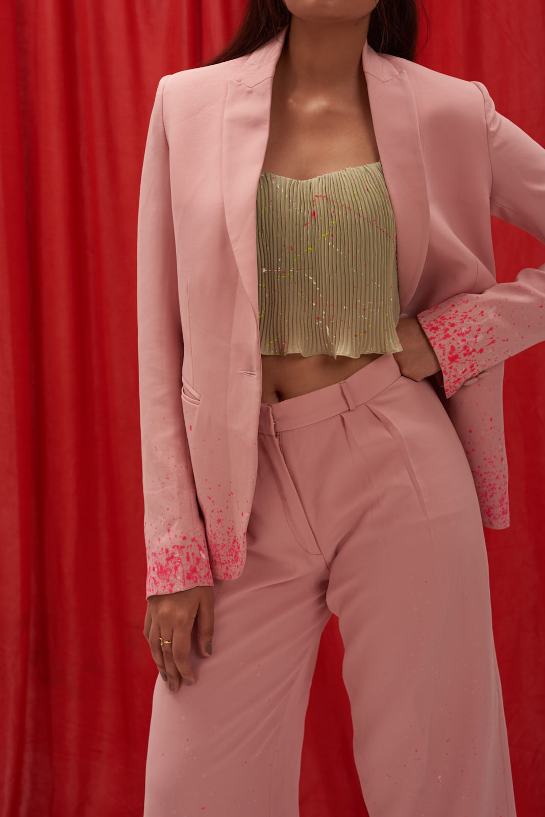 Regular price ₹ 8,500.00 Save ₹ -8,500.00Hand-painted scuba georgette ombre splash blazer with detailing on the hem of the pants.