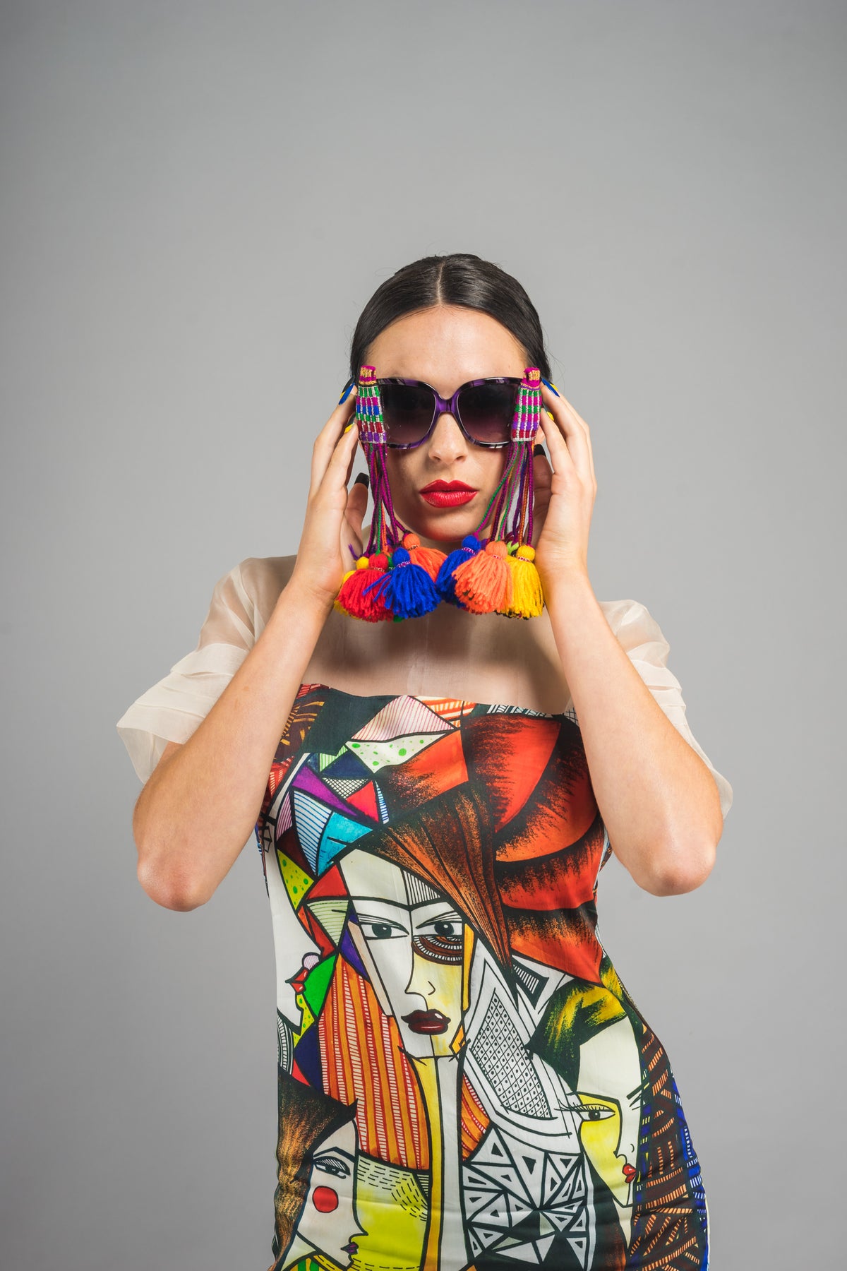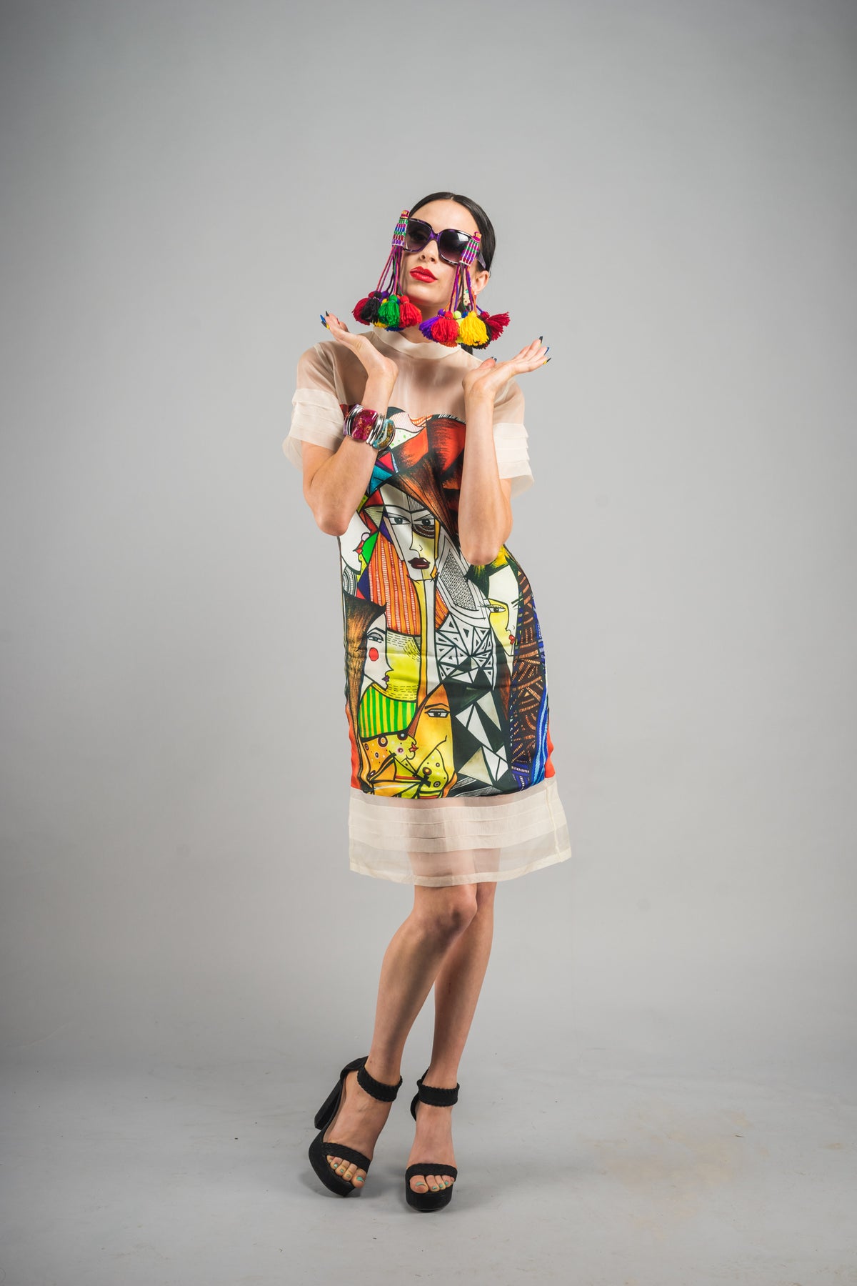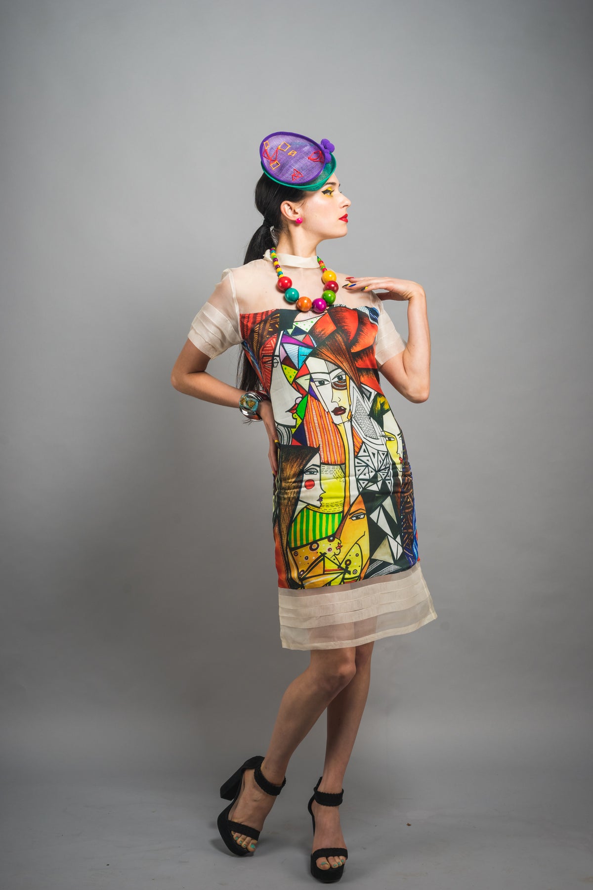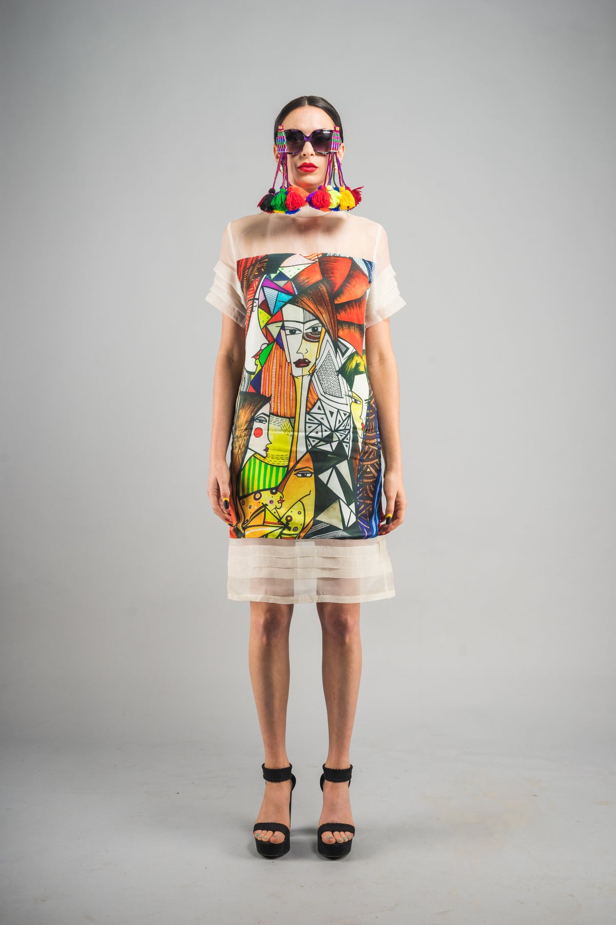Organza dress with digitally printed Picasso’s weeping women print patch and hand-pleat detailing on the hem and sleeves of the dress.