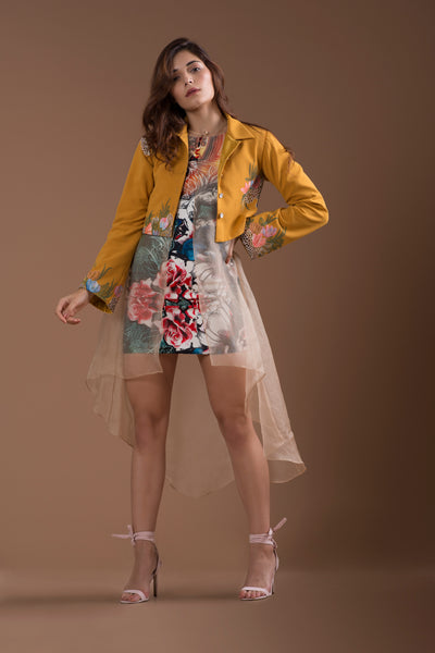 Regular price ₹ 8,000.00 Save ₹ -8,000.00Delicate beige organza asymmetric jacket paired with Hand illustrated and digitally printed self love print short body fit dress.